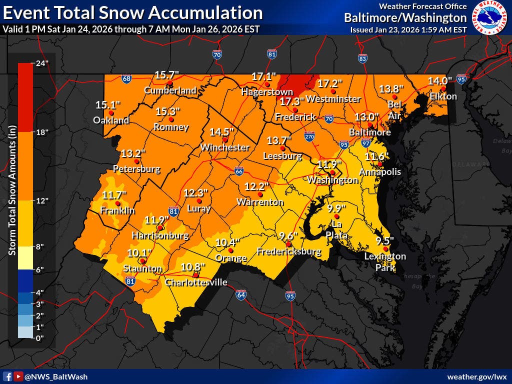 By Monday, Baltimore City could see 13 inches of snow on the ground. Nearby, predicted totals include more than 11 inches in Annapolis, nearly 14 inches in Bel Air, and 17 inches in Frederick and Westminster.