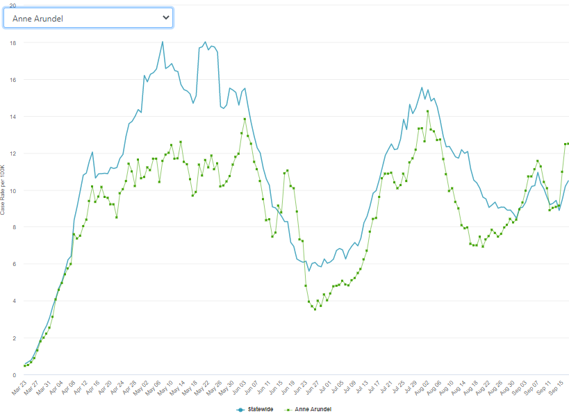 The most recent data clock Anne Arundel County's positivity rate at 3.72 percent, which is 0.51 percent higher than the statewide clip. The percent positivity started to decline after a recent spike to 4.45 percent on Sept. 7. That peak was nearly double the county's pandemic-low of 2.29 percent, which it registered on Aug. 16.