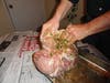 Cut ham into equal halves, width wise. Using a boning knife, hollow out a pocket for the stuffing in the middle of each half of your ham. Do not make the pocket so deep that you pierce the outside of the ham, which would cause the stuffing to leak. Spoon sauté mixture into each half and pack well.