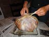 Once your ham and stuffing are thoroughly heated, remove from the oven and allow the ham some time to rest. After 10 to 15 minutes of rest time, separate the halves and place them flat (cut) side down on your cutting board.