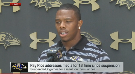 » Baltimore Ravens running back Ray Rice at a July 31 press conference. Photo Credit: Screenshot from ESPN