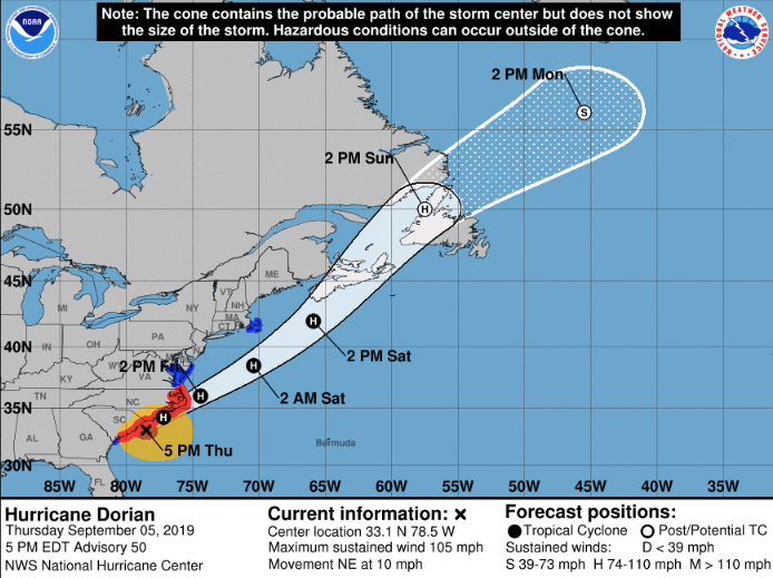Hurricane Dorian was about 45 miles south-southeast of Mrytle Beach, South Carolina, at 5 p.m. on Thursday, Sept. 5. It was moving north-northeast at 10 mph with maximum sustained winds of 105 mph. The National Hurricane Center reported it was 460 miles south-southwest of Ocean City at noon.