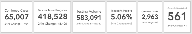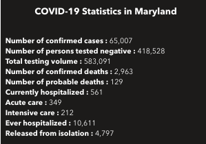 MARYLAND — About 400 people tested positive for the coronavirus in the past day in Maryland, where approximately 8,400 negative test results were also reported. There are 65,007 confirmed cases of the virus in the state, the Maryland Department of Health said Tuesday.