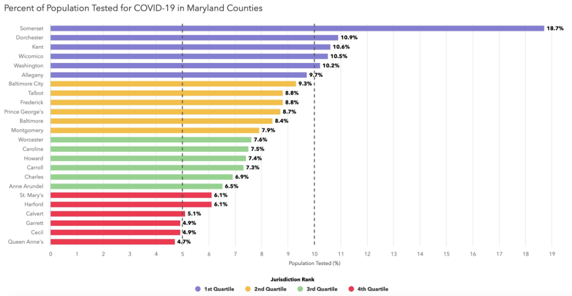 "Baltimore City leads large jurisdictions with 9.3% of its population tested," Maryland Gov. Larry Hogan said in a statement Tuesday, commending Mayor Bernard C. "Jack" Young and Health Commissioner Letitia Dzirasa "for their efforts to prioritize testing."