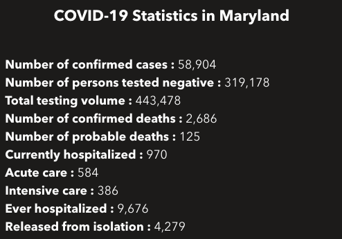 In Maryland 58,904 people have tested positive for the coronavirus, state health officials reported Tuesday morning, an increase of 500 confirmed cases in the past day. A total of 2,686 people in Maryland have died from the virus.
