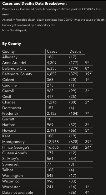 Baltimore County has the third most cases and deaths with 6,853 and 379, respectively, while Baltimore City is fourth with 6,355 confirmed cases of the virus and 279 COVID-19 deaths.