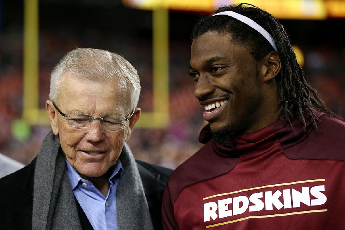 PHOTO: Former head coach Joe Gibbs of the Washington Redskins talks with quarterback Robert Griffin III #10 before a game between the Redskins and the Dallas Cowboys at FedExField on December 7, 2015 in Landover, Maryland. (Photo by Patrick Smith/Getty Images)