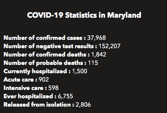 MARYLAND — With the addition of 982 new confirmed cases in the past day, the Maryland Department of Health is reporting Saturday morning that 37,968 people statewide have tested positive for the new coronavirus. So far the state has reported 152,207 negative test results.