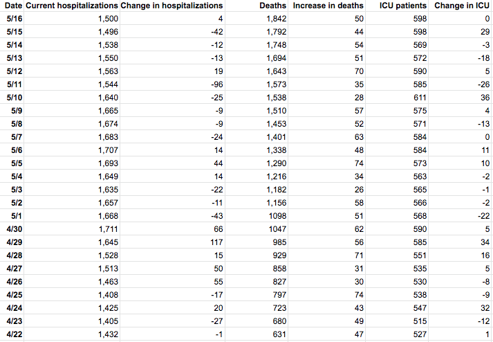 Statewide 1,500 people are hospitalized with the virus as of Saturday morning, health officials say, up from 1,496 on Friday. Admissions are flat on the intensive care unit, with 598 patients being treated for the coronavirus.