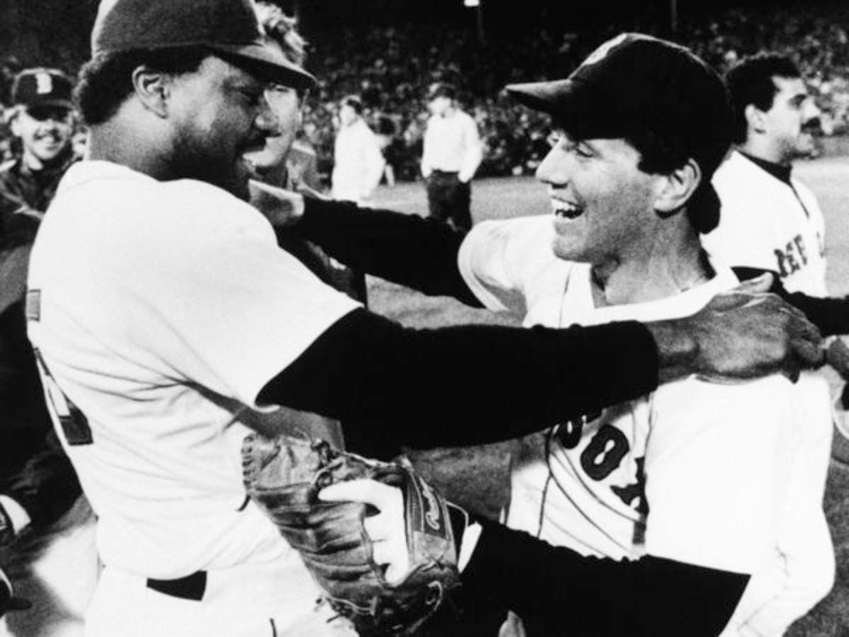 Photo caption: Baylor (left) embracing Marty Barrett after Red Sox win ALCS. (AP Photo/Peter Southwick)