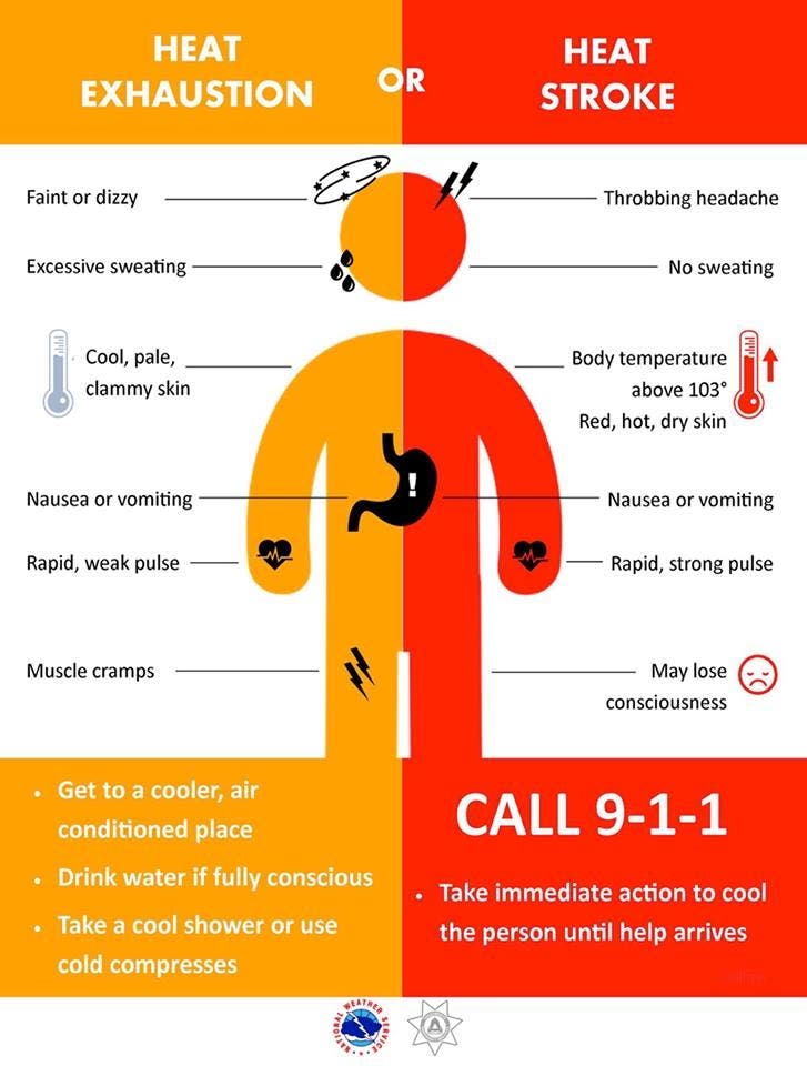 Call 911 if heat stroke is suspected. Heat stroke, the most serious heat-related illness, can be fatal if not treated immediately. It occurs when the body's temperature rises rapidly and the sweating mechanism fails, leading to overheating without a way to cool down. Symptoms of heat stroke include confusion; slurred speech; seizures; hot, dry skin or extreme sweating; altered mental status; very high body temperature; and loss of consciousness/coma.