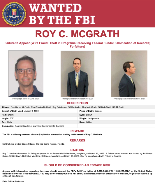 BALTIMORE, MD — The Federal Bureau of Investigation is offering a $10,000 reward in the manhunt for Roy McGrath, a former Maryland state government official who failed to appear in court two weeks ago on federal theft and fraud charges.