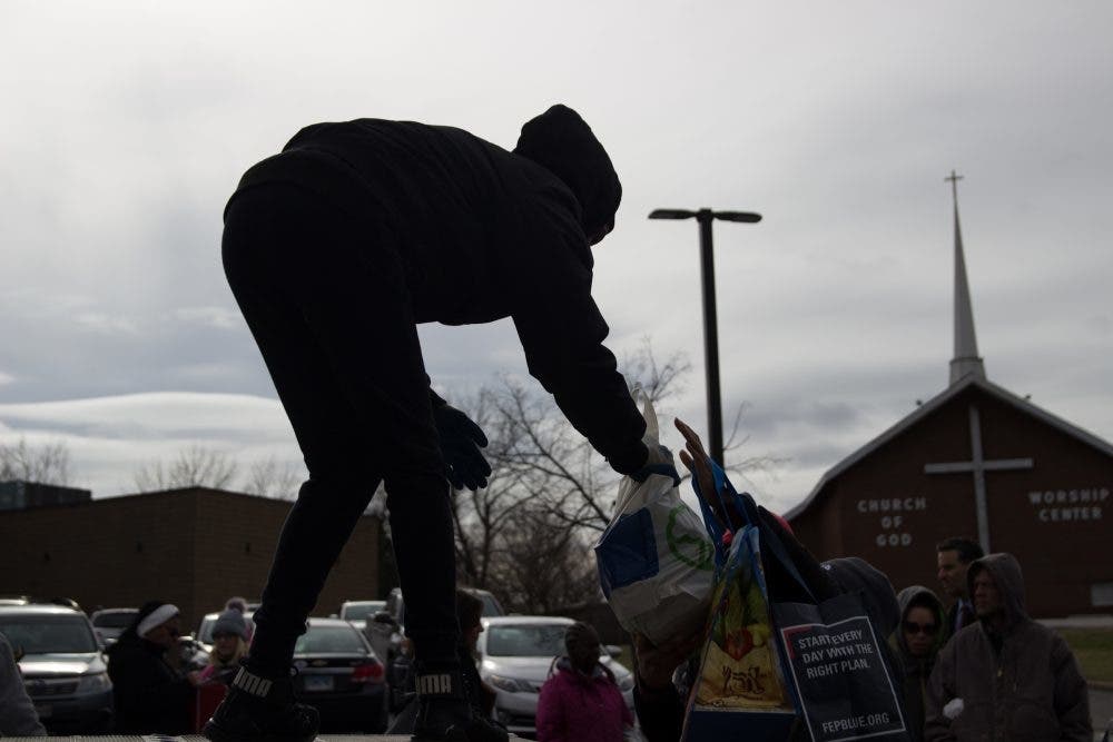 Pictured, Brandi Hunter (left), a Maryland Food Bank employee, passes out frozen goods from the truck bed to attendees of Wednesday’s food giveaway for furloughed government employees. (Jesse Nash/Capital News Service)