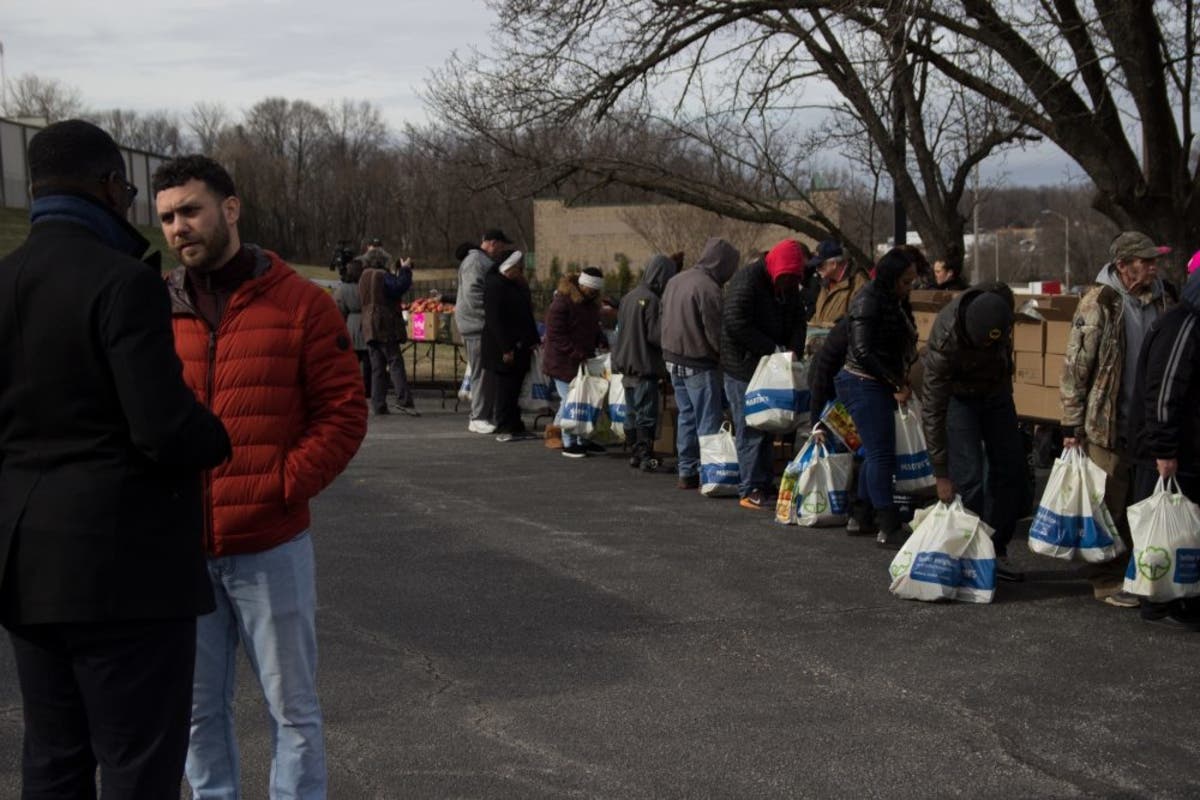 Pictured, President Jermaine Jones of the Metropolitan Baltimore Council AFL-CIO (far left) speaks with a reporter in Baltimore while families of furloughed federal workers pick up free food from the Maryland Food Bank. (Jesse Nash/Capital News Service)