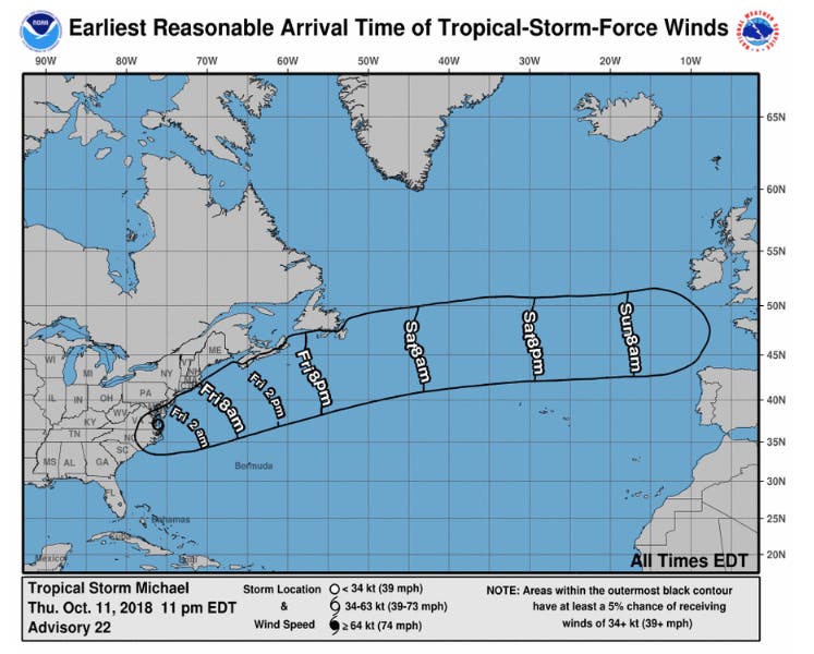As of 11 p.m. on Thursday, Tropical Storm Michael was 15 miles northeast of Norfolk, Virginia, according to the National Hurricane Center.