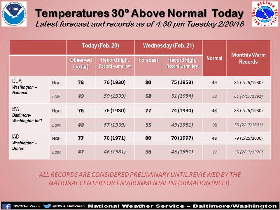 On Tuesday, authorities reported BWI tied the record of 76 degrees set on Feb. 20, 1930.