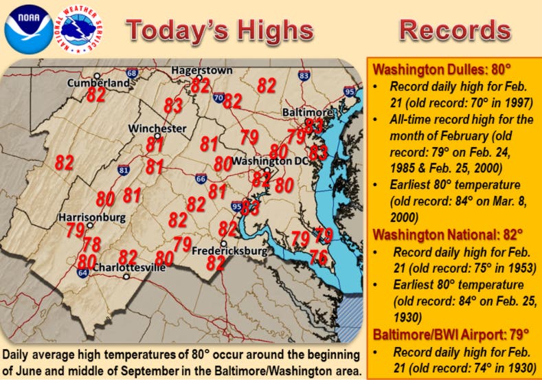 Take a look at Wednesday's record-breaking temps, when weather officials said BWI hit 79 degrees, shattering the previous record of 74 degrees from Feb. 21 in 1930.