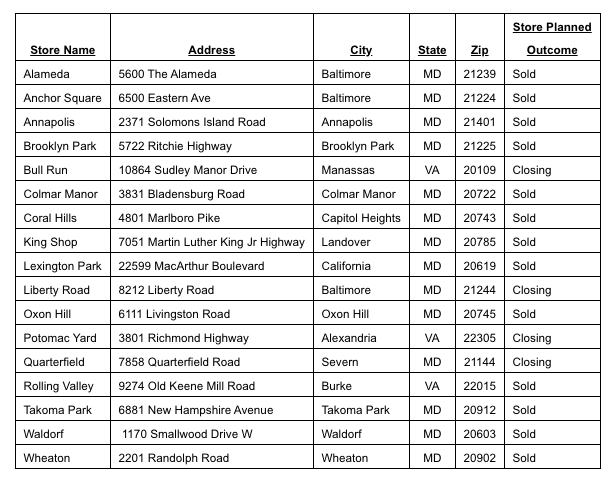 UNFI will close the Shoppers stores at 8212 Liberty Road in Baltimore and 7858 Quarterfield Road in Severn by the end of January 2020. Two northern Virginia stores in Alexandria and Manassas will also close.