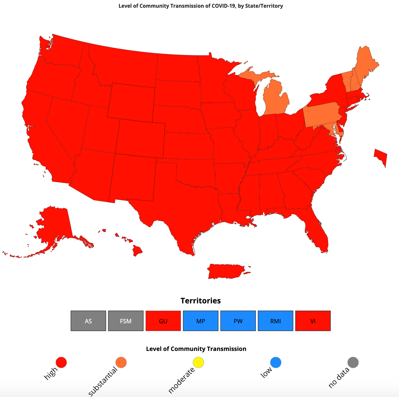 Maryland is one of six states with "substantial" transmission. Maine, Michigan, New Hampshire, Pennsylvania and Vermont. All others have been deemed "high" transmission.