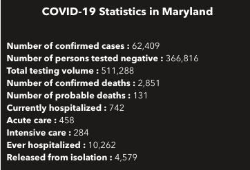There are 62,409 confirmed cases of coronavirus in Maryland as of Tuesday, according to state health officials.