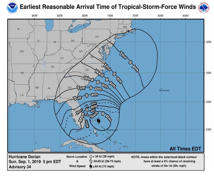 Later this week, Maryland may feel the effects from Dorian, the National Weather Service advised. The storm may deliver tropical storm-force winds to Maryland shores by Thursday, Sept. 5, based on projections issued Monday, which are subject to change. Tropical storm-force winds are defined as those 39 to 73 mph.