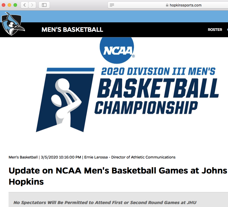 "In light of Maryland's recently confirmed cases of COVID-19, and based on CDC guidance for large gatherings, we have determined that it is prudent to hold this tournament without spectators," Johns Hopkins Athletics said in a statement on its website.