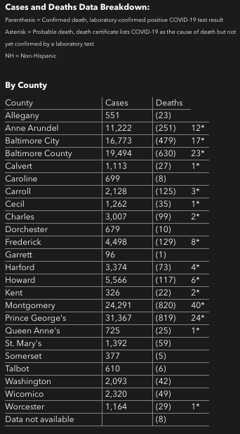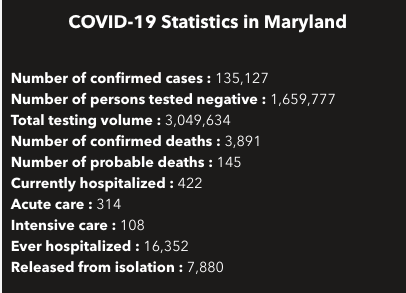 Here is the data about the coronavirus in Maryland from the state health department as of Saturday, Oct. 17: