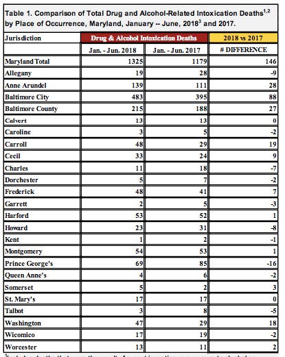See the full report on overdose deaths from the first half of 2018 from the Maryland Department of Health, and find past overdose data from the state.
