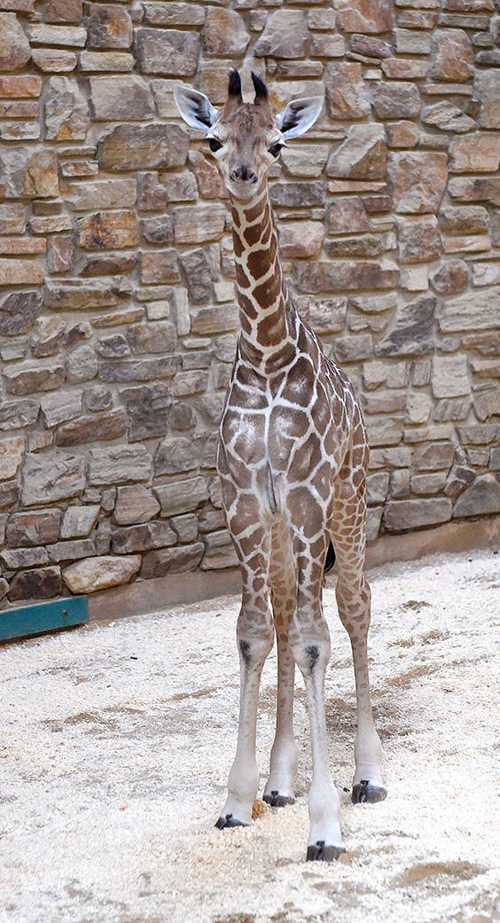Mom went into labor at 3 p.m.; the calf was born at 4:35 p.m.; and by 5:30 p.m., the baby was standing up. The baby giraffe measured 6 feet 1 inch tall and 125 pounds.