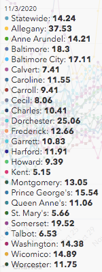 Here are the latest coronavirus case rates per 100,000, according to the Maryland Department of Health: