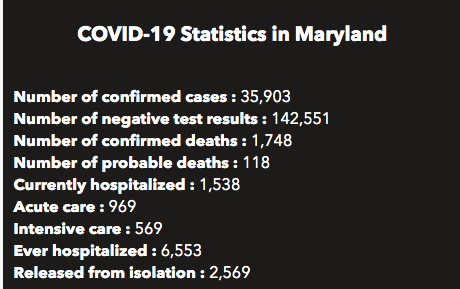 MARYLAND — With the addition of 1,091 new confirmed cases in the past day, the Maryland Department of Health reported Thursday morning that 35,903 people have tested positive for the new coronavirus.