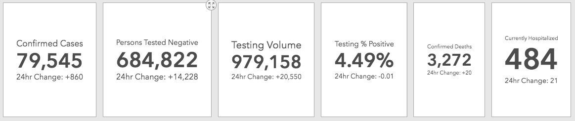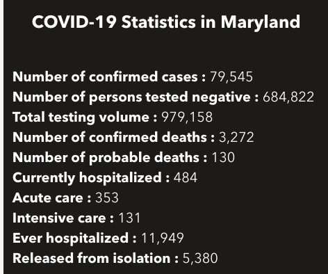 There are 79,545 cases of the virus statewide, an increase of 860 in the last day. As of Tuesday morning, the positivity rate in Maryland is 4.49 percent, data shows, down slightly from Monday.