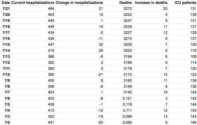 On Tuesday, officials said 3,272 people have died from COVID-19 statewide since the pandemic began, an increase of 20 deaths reported in the last day. That is the largest daily increase in reported deaths since June 25.