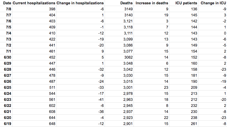 - July 8 — 398 hospitalized; 136 in intensive care; 3,149 deaths