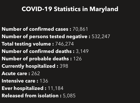 According to the Maryland Department of Health, there are 70,861 confirmed cases of the virus as of Wednesday, July 8.