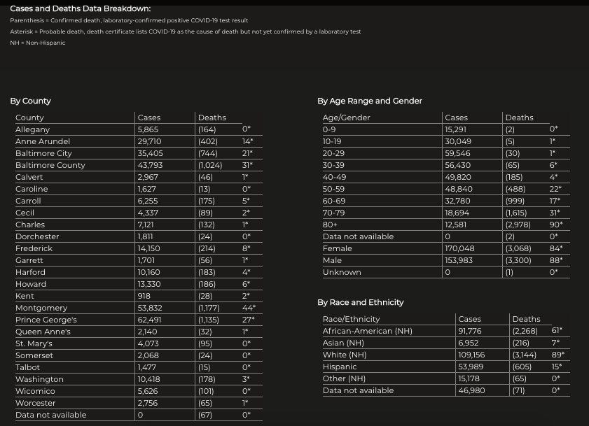 Montgomery, Prince George's and Baltimore counties have all seen more than 1,000 deaths from the virus, according to the Maryland Department of Health.