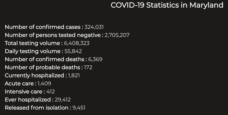 Nearly 3,300 cases of the coronavirus have been added in the past day to Maryland's tally, state health officials reported Saturday. There are now more than 324,000 cases of the virus in the state.