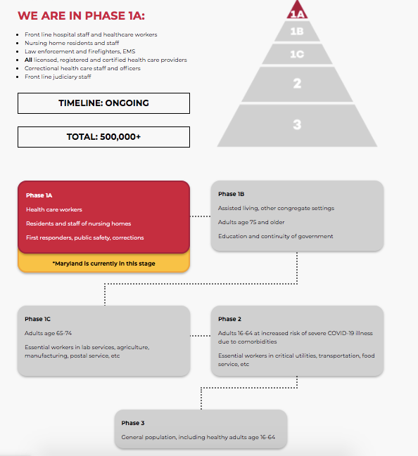 Starting Monday, Jan. 18, Maryland will enter phase 1B of its vaccination plan, in which those over 75 years old, residents of group homes or other congregate living facilities, school staff, child care providers, and high-risk inmates will also be eligible for the COVID-19 vaccine.