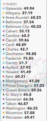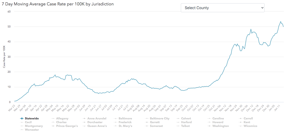 After three days of decreases, the case rate is now 49.94 cases per 100,000 statewide, the Maryland Department of Health reported Saturday, Jan. 16.