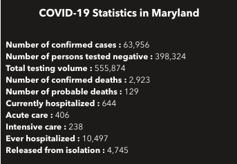 Since the pandemic began in March, state health officials say more than 555,000 coronavirus tests have been administered across Maryland, and nearly 10,500 people have been hospitalized with the virus. Over 4,700 have been released from isolation. A total of 2,923 people have died from the coronavirus, state health officials reported Saturday.