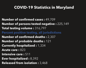 “Each day, we are conducting more tests and offering more places for Marylanders to get tested,” Hogan said in a statement. Maryland has conducted 316,797 tests as of Thursday morning, he said.