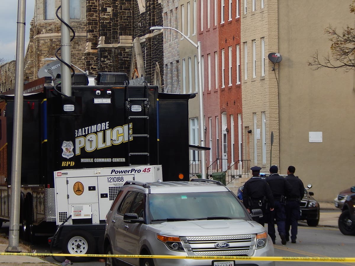 Members of the neighborhood activist group Baltimore BLOC gathered around West Franklin Street near the restricted area Sunday, watching as detectives prohibited outsiders, including a pastor, from entering the neighborhood.