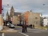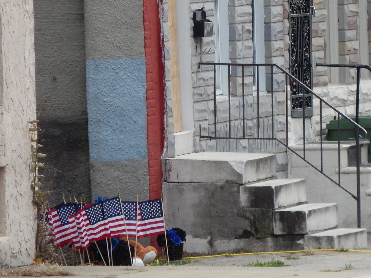 Outside one rowhouse, several American flags had been planted in a memorial to the fallen detective.