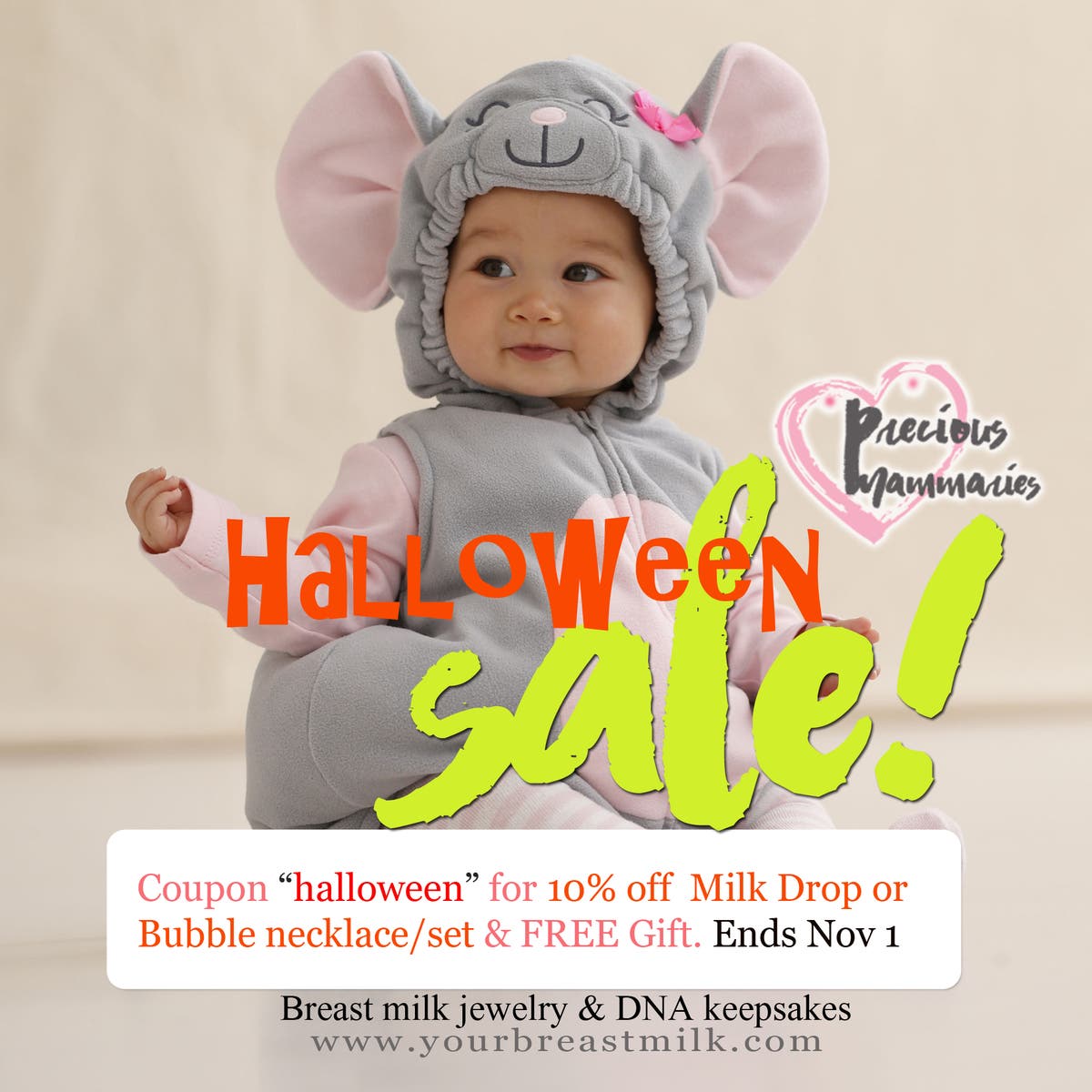 This year, it’s not just kids that will get the goodies. Scary moms can score 10% off on her choice of either the popular Milk Drop or Bubble necklaces or sets from Precious Mammaries.