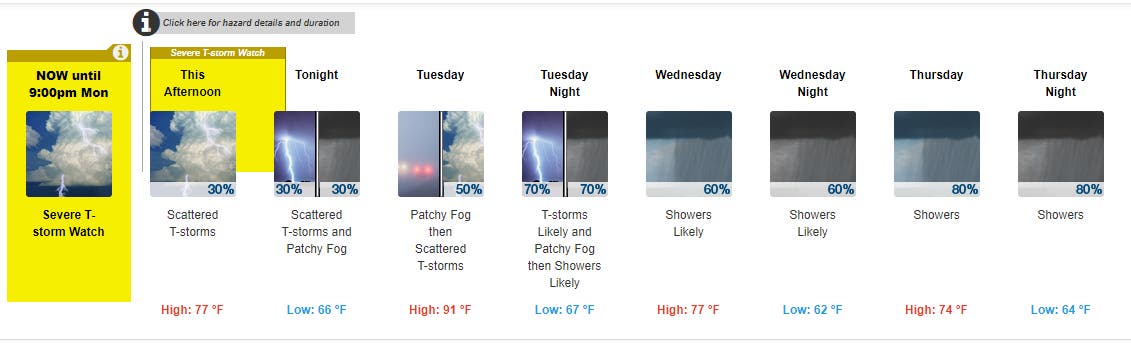 The National Weather Service issued a severe thunderstorm watch on Monday afternoon, and the forecast is looking rainy all week long.