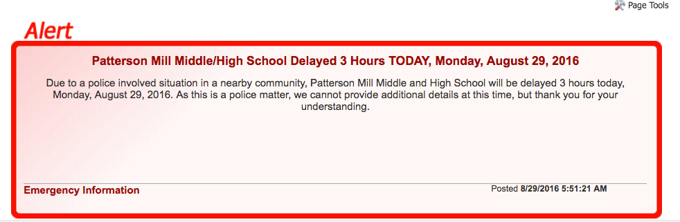 PREVIOUS REPORT — Patterson Mill Middle and High schools are opening three hours late on Monday, Aug. 29, due to police activity in the area, Harford County Public Schools officials said.