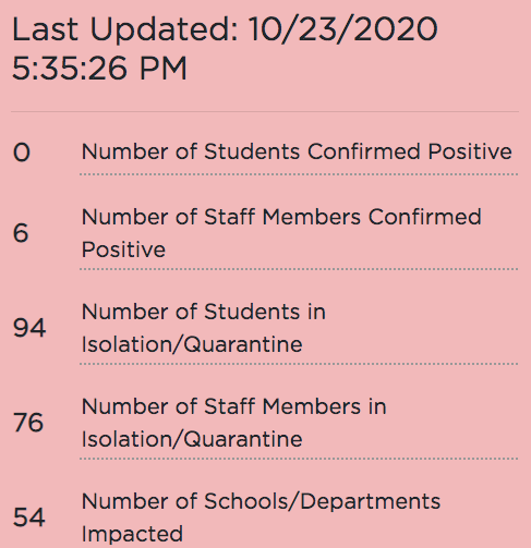 Six staff members have confirmed cases of the virus, while no students have tested positive, according to the school system's report released Friday, Oct. 23.
