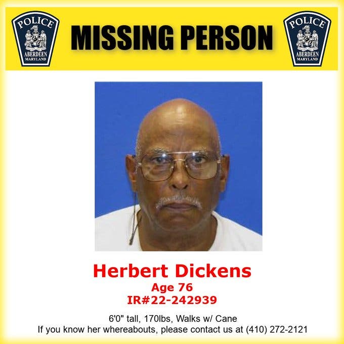If anyone sees Dickens or knows his whereabouts, they are asked to call the Aberdeen Police Department immediately at 410-272-2121.