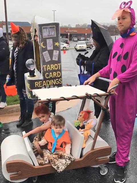 Last year, he dressed up as Fred Flintstone, behind the wheel of the Flintstone-mobile his dad (Dino) made from a Toys R Us shopping cart. He said that took him about three weeks.