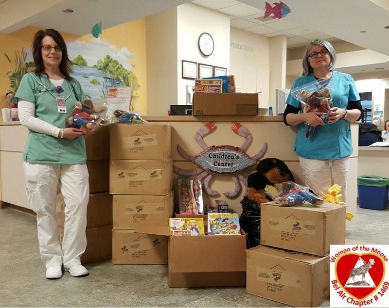 Senior Regent Lisa Phillips (not pictured) and the co-workers of Bel Air Chapter #1469 Women of the Moose held a quarter auction, then donated proceeds of over $2,500 in cash and therapeutic toys to the pediatric floor of University of Maryland Upper Chesapeake Medical Center.